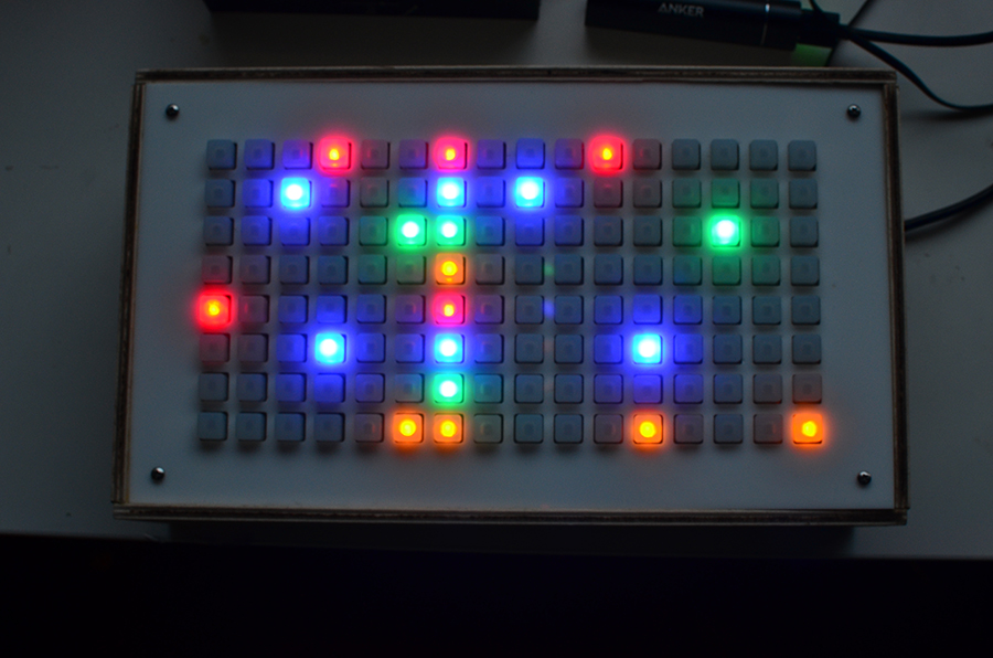 The device utilizes a 8 x 16 button grid with the X-axis representing the beat (from left to right) and the Y-axis representing a tone in a pentatonic harmonic scale. Users press on a button to activate it, and all notes that are activated in the same column (x-value) will output their associated y-value-based notes together, and the system will loop through and around the X-axis.