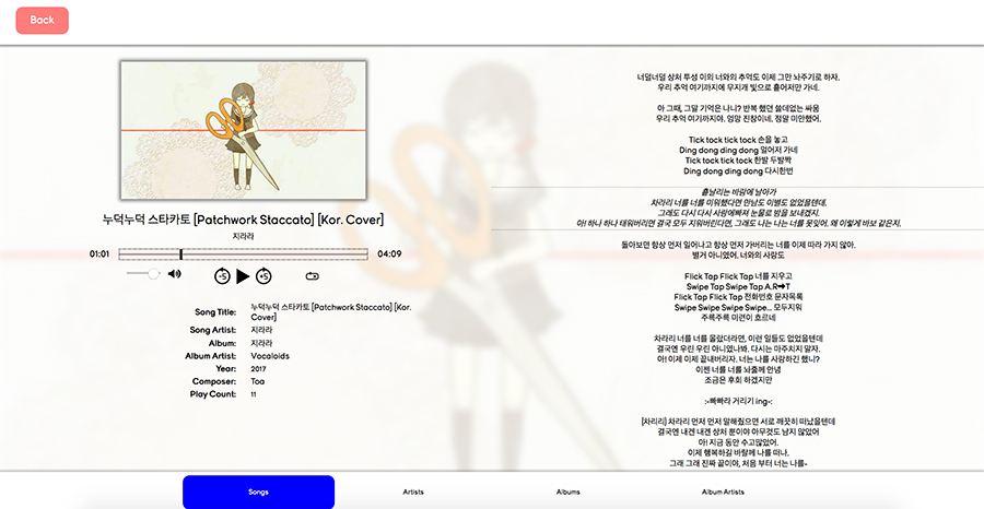 The Full-Function Music Player, or “FFMP” in short, was the basis for the creation of the SMP, which retains much of the same framework as the FFMP with optimized code and additional improvements. The FFMP originally aimed to replicate the functionality of other public music players such as iTunes and Spotify. Users are given the ability to upload individual song files and categorical tags prior to upload (i.e. song title, artist, album artist). Songs can be divided between “Songs”, “Artists”, “Albums”, and “Album Artists” (“Playlists” are not available in this version), which allows for organizing audio based on user preference.