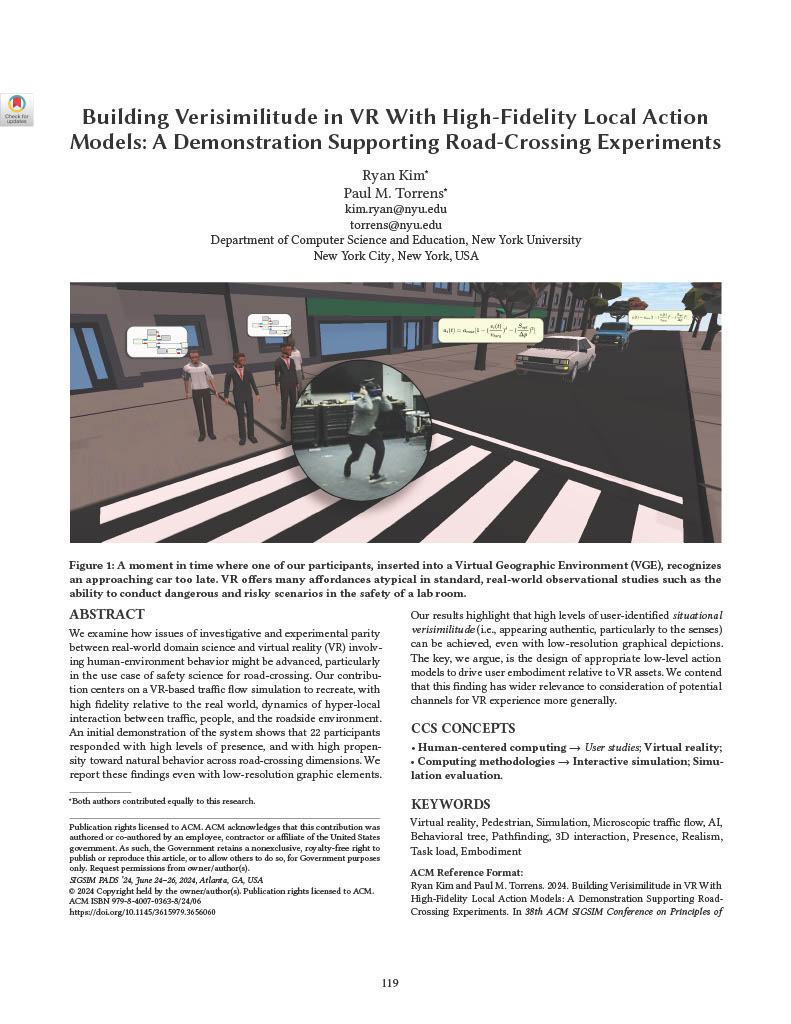 - Kim, R., & Torrens, P. M. (2024). Building verisimilitude in vr with high-fidelity local action models: a demonstration supporting road-crossing experiments. Proceedings of the 38th ACM SIGSIM Conference on Principles of Advanced Discrete Simulation (pp. 119–130). New York, NY, USA: Association for Computing Machinery. URL: https://doi.org/10.1145/3615979.3656060, doi:10.1145/3615979.3656060