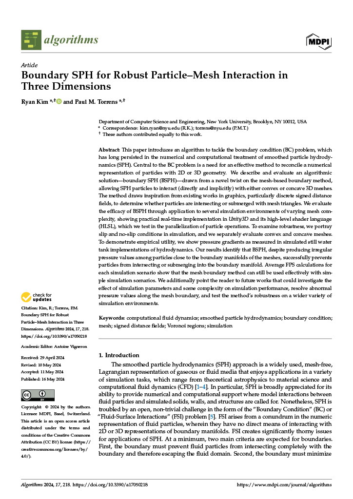 - Kim, R., & Torrens, P. M. (2024). Boundary sph for robust particle-mesh interaction in three dimensions. Algorithms, 17(5). URL: https://www.mdpi.com/1999-4893/17/5/218, doi:10.3390/a17050218