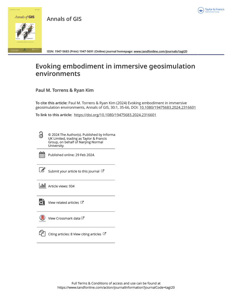 - Torrens, P. M., & Kim, R. (2024). Evoking embodiment in immersive geosimulation environments. Annals of GIS, 30(1), 35–66. URL: https://doi.org/10.1080/19475683.2024.2316601, arXiv:https://doi.org/10.1080/19475683.2024.2316601, doi:10.1080/19475683.2024.2316601