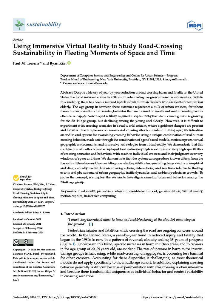 - Torrens, P. M., & Kim, R. (2024). Using immersive virtual reality to study road-crossing sustainability in fleeting moments of space and time. Sustainability, 16(3). URL: https://www.mdpi.com/2071-1050/16/3/1327, doi:10.3390/su16031327