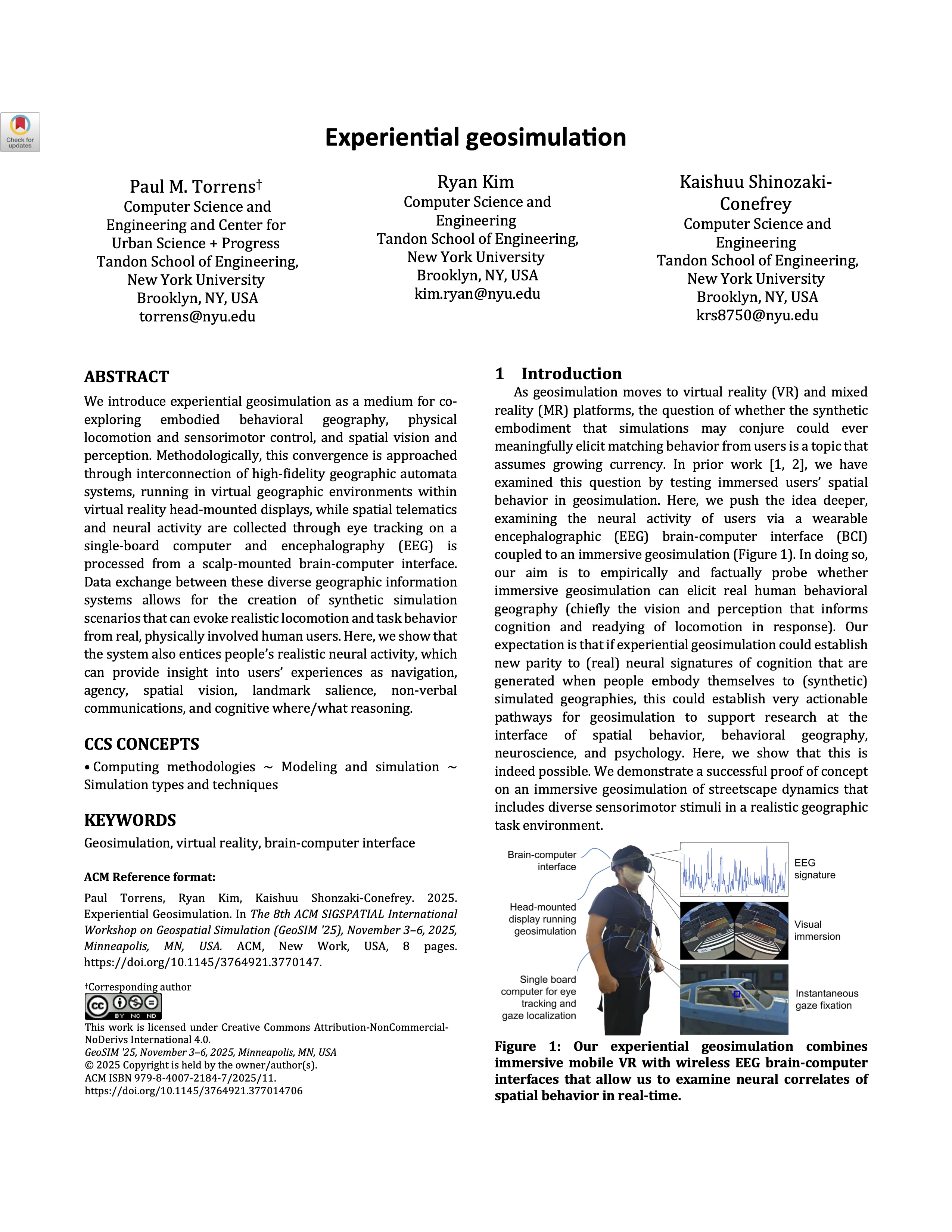 - Torrens, P. M., Kim, R., & Shinozaki-Conefrey, K. (2025). Experiential geosimulation. Proceedings of the 8th ACM SIGSPATIAL International Workshop on Geospatial Simulation (pp. 12–20). New York, NY, USA: Association for Computing Machinery. URL: https://doi.org/10.1145/3764921.3770147, doi:10.1145/3764921.3770147