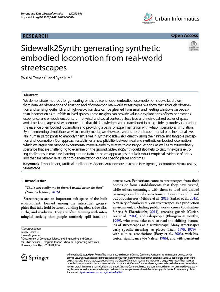 - Torrens, P. M., & Kim, R. (2025 , August). Sidewalk2synth: generating synthetic embodied locomotion from real-world streetscapes. Urban Informatics, 4(1). URL: http://dx.doi.org/10.1007/s44212-025-00081-z, doi:10.1007/s44212-025-00081-z